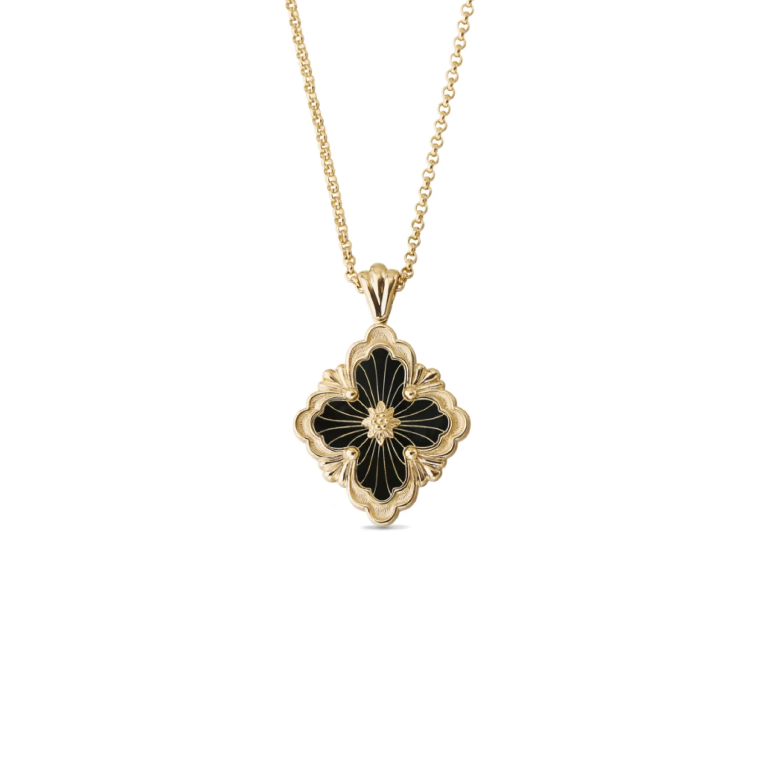 An intricately designed pendant featuring a radiant yellow gold-inspired emblem set against a striking colorful enamel backdrop. Delicate radial patterns evoke the elegance of fine lacework, while a golden rosette takes center stage. Finished with scalloped, fan-shaped edges and paired with a sleek yellow gold chain, this piece is a timeless statement of refined beauty.
