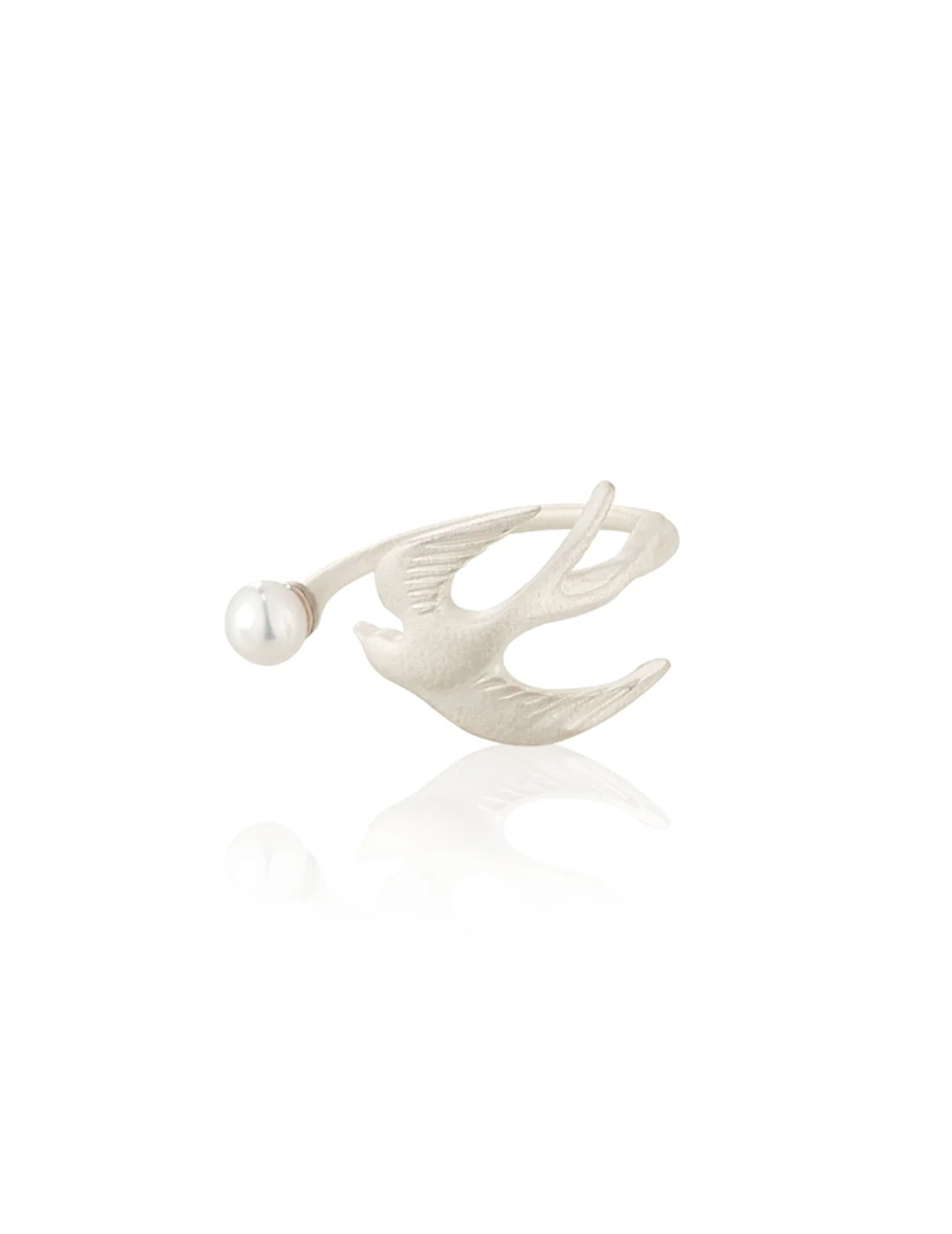 This statement ring features a soaring swallow motif paired with a pearl accent, forming a dynamic, open composition across the finger. The bird’s wings are extended in mid-flight, creating a sense of movement through clean, sculptural lines.