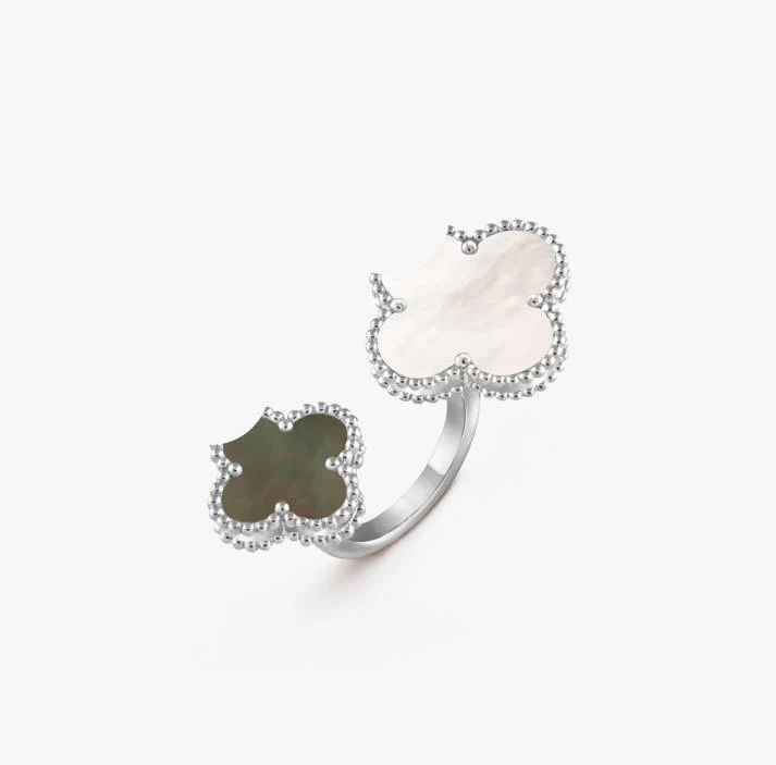 This Magic Clover Leaf Between The Finger Ring is made with 18K Gold Vermeil, featuring a 925 sterling silver base coated with a 2.5-micron layer of 18K yellow or white gold for a polished, radiant finish. The 5mm band is highlighted with sparkling gemstones, adding to its timeless charm.
