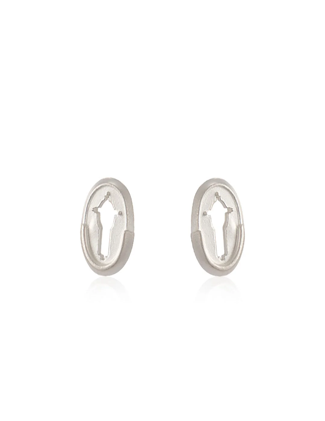 These stud earrings feature a keyhole and cross motif, presented in a compact and balanced composition. Each symbol is clearly defined, with clean contours that emphasize contrast while maintaining a minimal, structured appearance.