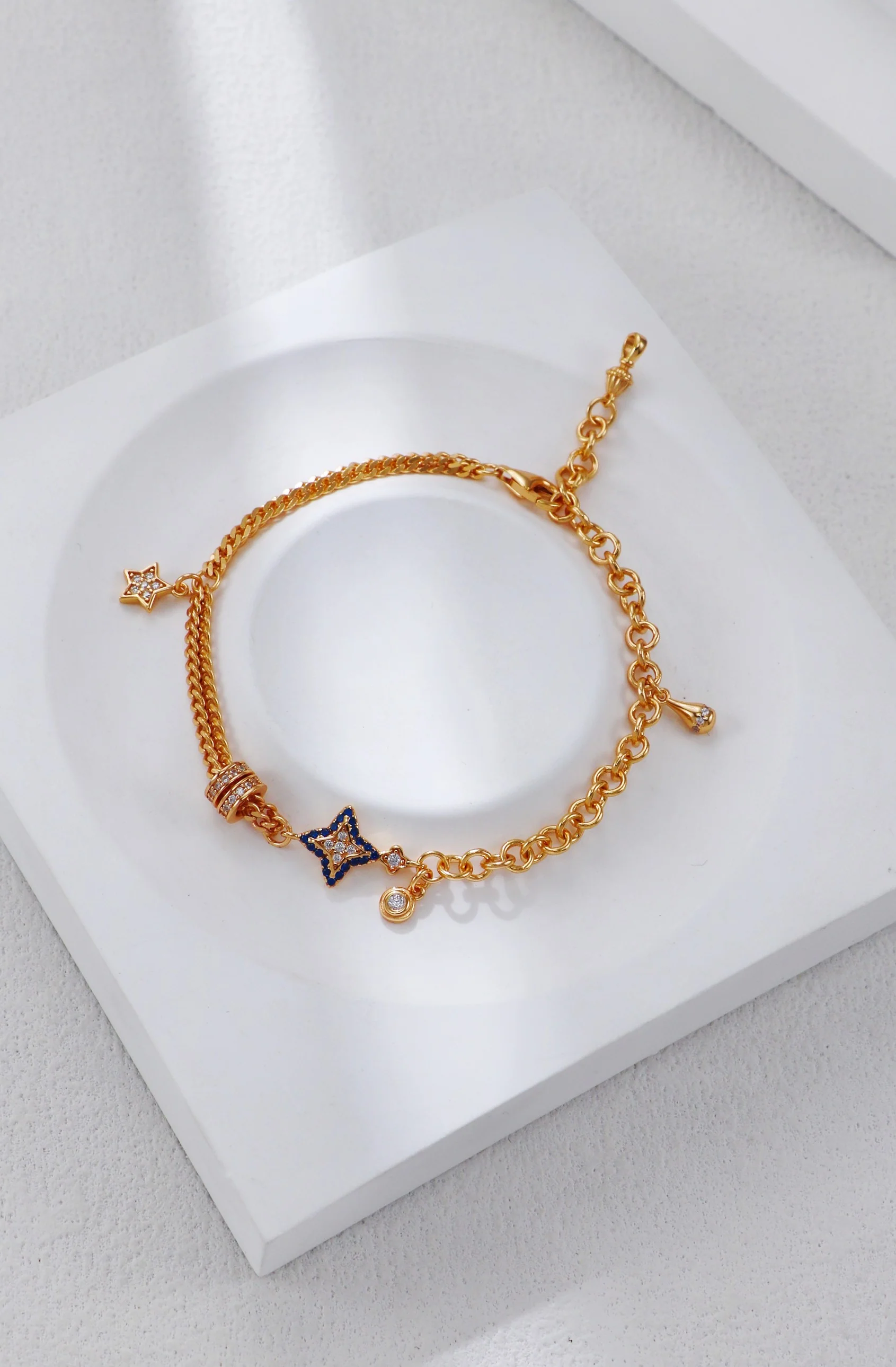 Inspired by the beauty of the night sky, this Sterling Silver Zircon Bracelet features delicate star-shaped charms adorned with sparkling zircon stones. The blue and white accents create a dreamy celestial effect, making it a statement piece for any jewelry lover.